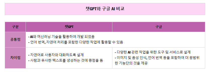 이와 같은 다양한 이슈를 몰고 다니는 챗GPT는 과연 구글 AI와 어떤 점이 다를까요? 아래와 같이 정리해보았습니다.
