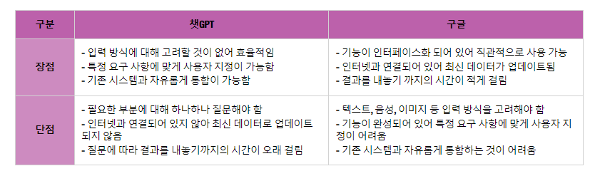 비슷한 방식으로 개발되고, 다양한 작업에 활용된다는 점이 같으나 명령을 내리는 방식과 결과물에는 차이가 있었습니다. 그렇다면, 사용자 입장에서 본 구글 AI와 챗GPT의 장단점은 어떠할까요?