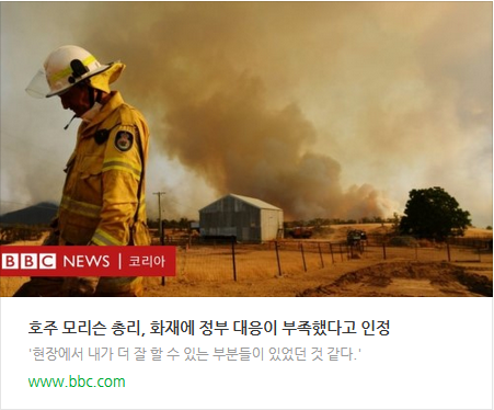 호주의 모리슨 총리는 이전부터 산불 사태의 원인으로 지목되는 기후 변화에 정부 대책이 부족하다는 비난을 받아왔습니다. 그리고 지난 12일 모리슨 총리는 ABC 방송과의 인터뷰에서 “현장에서 내가 더 잘할 수 있는 부분들이 있었던 것 같다”라고 실책을 인정했습니다. 화재가 한창 진행중이던 지난 12월 말 모리슨 총리는 가족과 함께 하와이로 휴가를 떠났었는데요, 당시는 이미 산불로 9명이 목숨을 잃은 상태였고, 두 명의 소방관이 잇따라 목숨을 잃었기에 국가 재난 사태에 휴가를 떠난 모리슨 총리에 대한 호주 시민들의 분노가 폭발했고 여론의 뭇매를 맞고 모리슨 총리는 다시 돌아와야 했습니다. 이 후 몇번의 대국민 사과가 있었지만 호주 시민들의 분노는 여전히 줄어들지 않았죠. 지금도 여전히 호주는 더욱 더 높아져가는 기온 속에서 산도 불타고, 마땅한 대안을 제시하지 못하는 정부에 대해 시민들의 분노도 불타오르고 있는 상황입니다.
